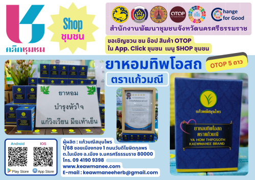 สำนักงานพัฒนาชุมชนจังหวัดนครศรีธรรมราช ประชาสัมพันธ์เชิญชวน ชม ช็อปสินค้า OTOP ของจังหวัดนครศรีธรรมราช ได้แก่ ยาหอมทิพโอสถ ตราแก้วมณี ของผู้ประกอบการ OTOP แก้วมณีสมุนไพร เลขที่ 1/68 ซอยเมืองทอง 1 ถนนวันดีโฆษิตกุลพร ตำบลในเมือง อำเภอเมือง จังหวัดนครศรีธรรมราช จากร้านค้าใน Shop ชุมชน ผ่านแอปพลิเคชัน Click ชุมชน โดยการดาวน์โหลดแอปพลิเคชัน Click ชุมชน ซึ่งมีเมนูบริการมากกว่า 13 เมนู “แอปเดียวจบ ครบเรื่องชุมชน” เรียนรู้ ดู เที่ยว ทั่วไทย ไปกับ Click ชุมชน ผ่านช่องทางการดาวน์โหลด และเว็บไซต์ ดังนี้