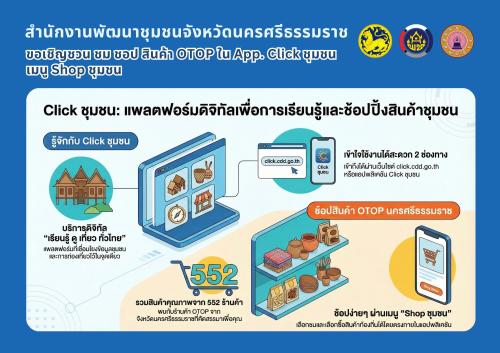 สำนักงานพัฒนาชุมชนจังหวัดนครศรีธรรมราช จัดทำสื่อประชาสัมพันธ์ร้านค้าใน Shop ชุมชน เพื่อเชิญชวนผู้ที่สนใจเข้าชม ช็อป สินค้า OTOP และผลิตภัณฑ์ชุมชนของจังหวัดนครศรีธรรมราช ซึ่งมีมากกว่า 500 ร้านค้า ให้เพื่อสร้างรายได้สู่ชุมชน ผ่านแอปพลิเคชัน Click ชุมชน โดยคลิกที่เมนู Shop ชุมชน